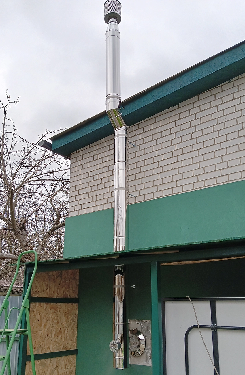 От тройника вверх собран вертикальный стояк дымохода с надежным креплением к фасаду здания. Далее выполнен проход через небольшой навес (дашок), после чего трасса дымохода аккуратно обведена вокруг свеса основной кровли с использованием колен под 45°. Такое техническое решение позволило сохранить правильную геометрию дымохода и обеспечить стабильную тягу без лишних сопротивлений.