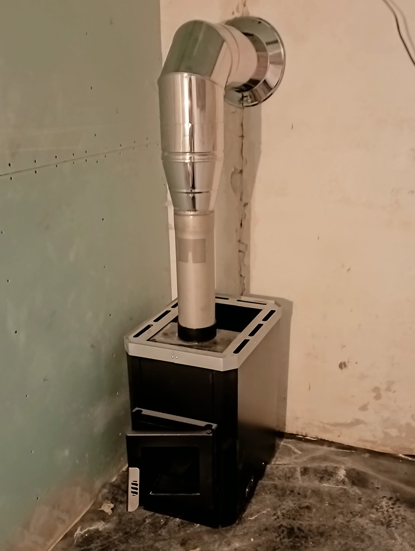Дымоход смонтирован по схеме выхода через стену. От печи выполнен небольшой вертикальный участок для разгона тяги, который далее через колено 90° переходит в горизонтальный. После этого установлен тройник с боковой ревизией. Такое решение обеспечивает удобный доступ для обслуживания и регулярной чистки как горизонтального, так и вертикального участков дымохода.