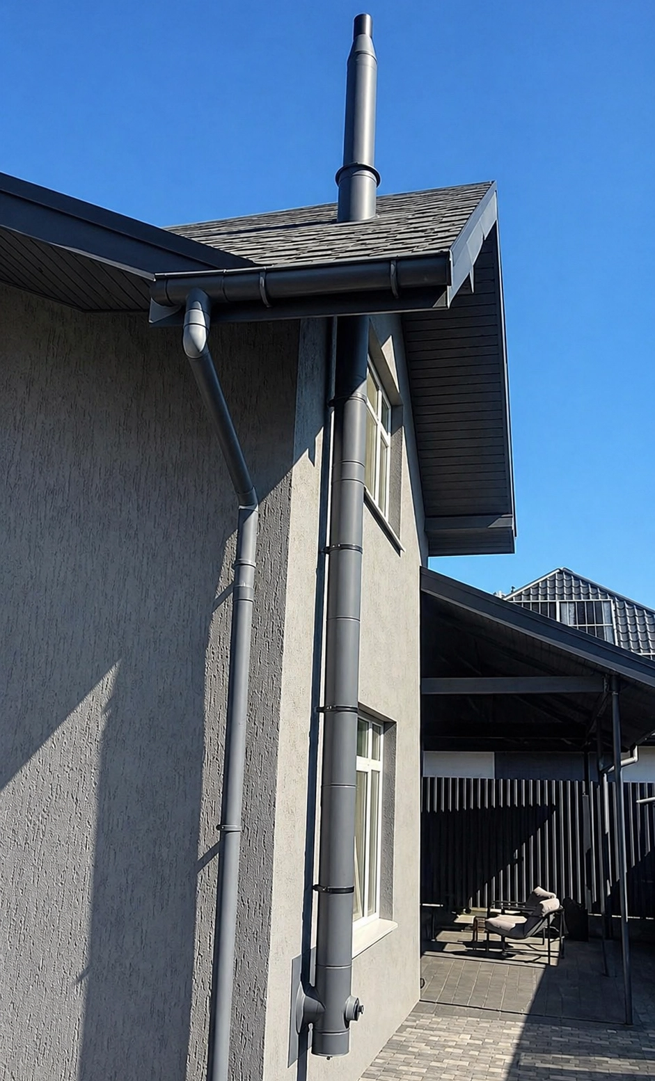 Труба окрашена в цвет дома — RAL 7024, что позволило гармонично вписать её в общий внешний вид фасада. Монтаж выполнен через стену по фасаду здания, с проходом через свес кровли. В месте прохода выполнено отверстие и качественная герметизация для защиты от влаги.
