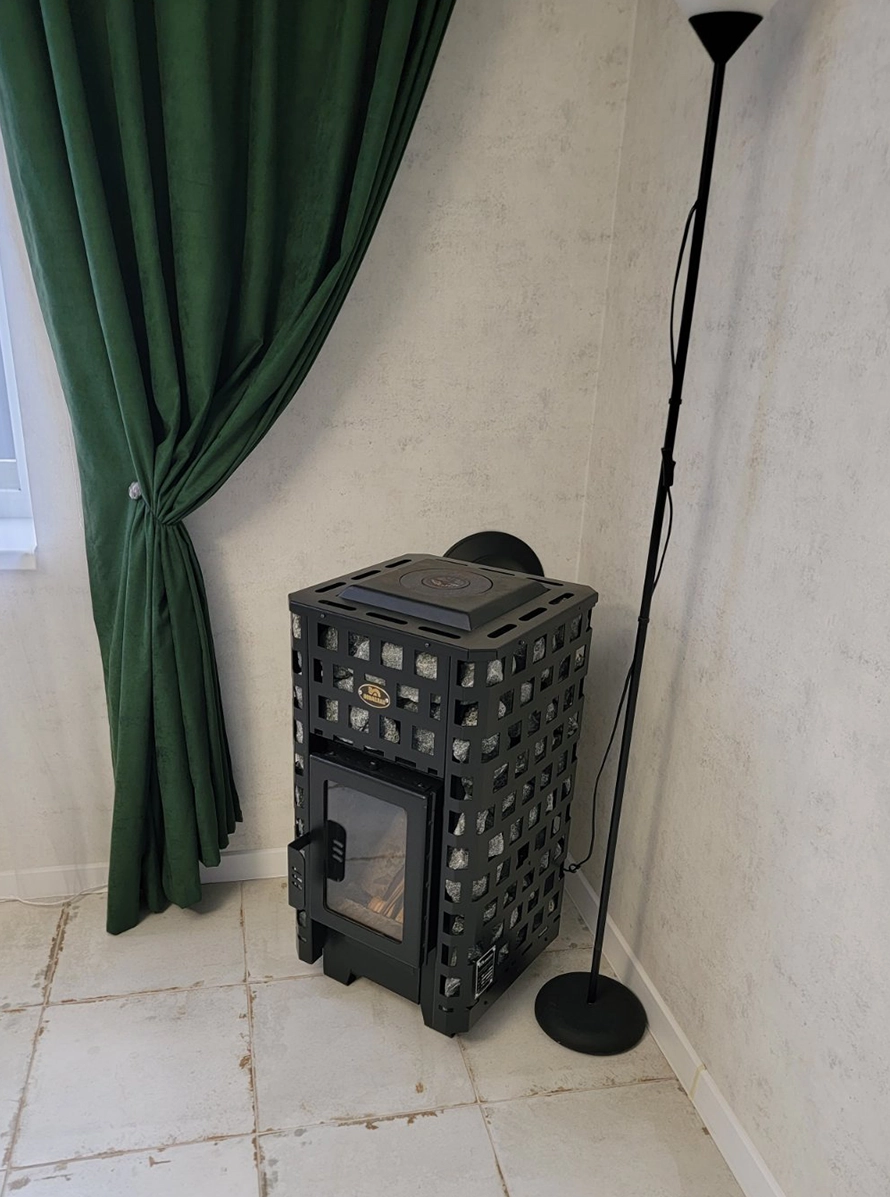 Печь имеет перфорированный металлический кожух, внутри которого засыпаны камни. Такая конструкция не только придаёт эстетичный вид, но и обеспечивает эффективное накопление и равномерную отдачу тепла. Печь установлена в углу комнаты, что позволяет рационально использовать пространство без потери производительности.