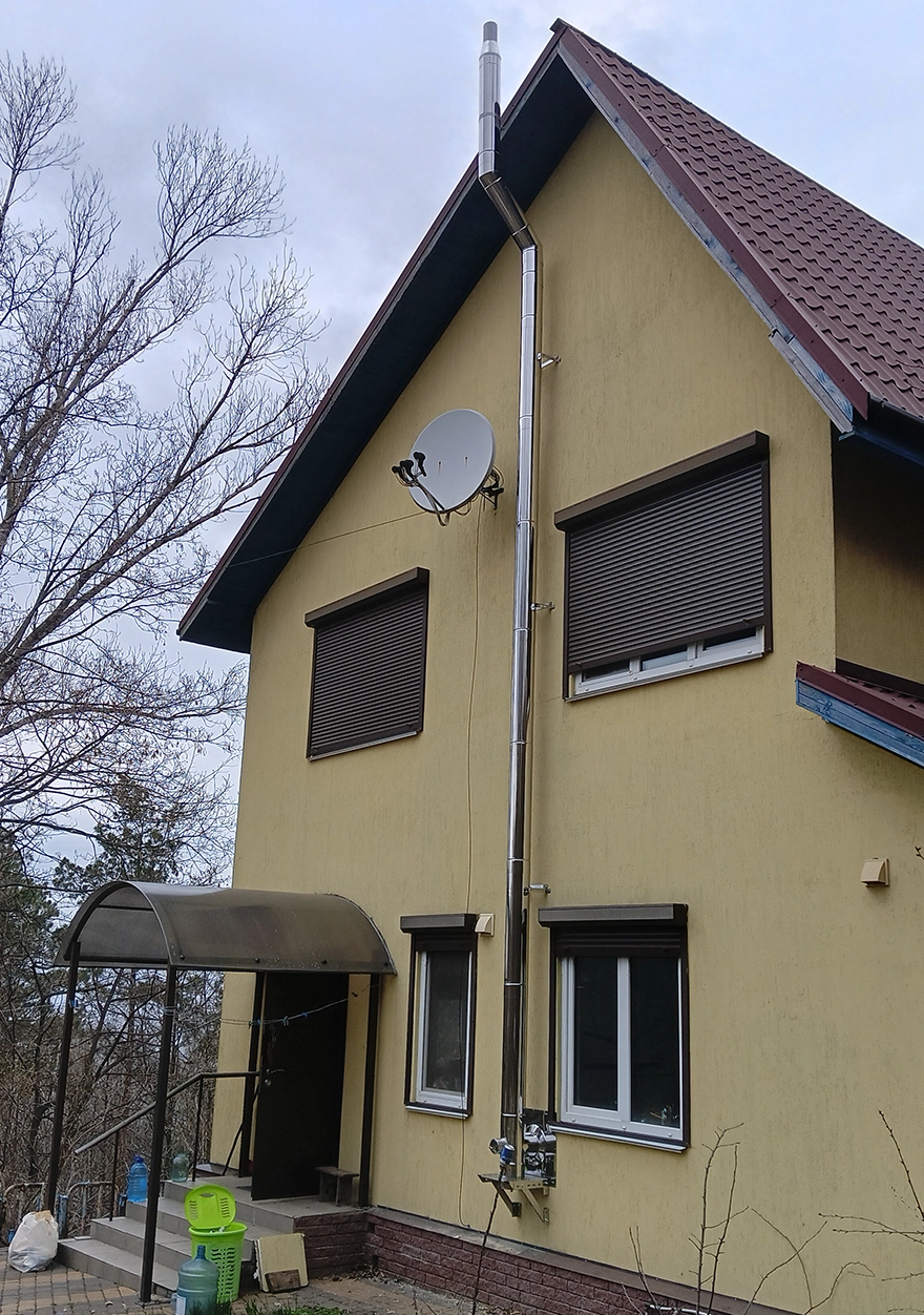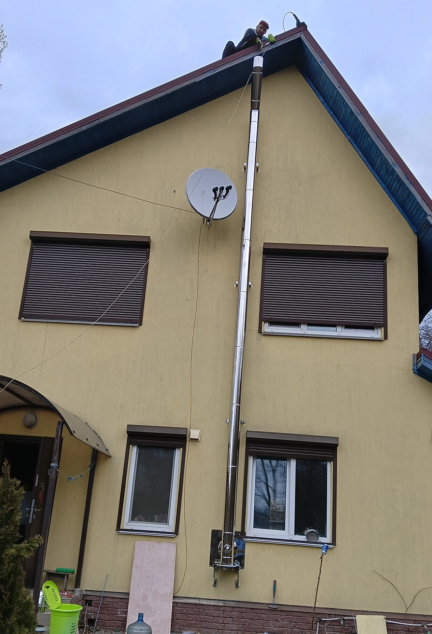 Димохід змонтовано вздовж фасаду будівлі. Підключення виконано на рівні першого поверху, після чого система переходить у вертикальну ділянку та піднімається вище рівня покрівлі. Висота димоходу відповідає чинним нормам і забезпечує стабільну тягу.