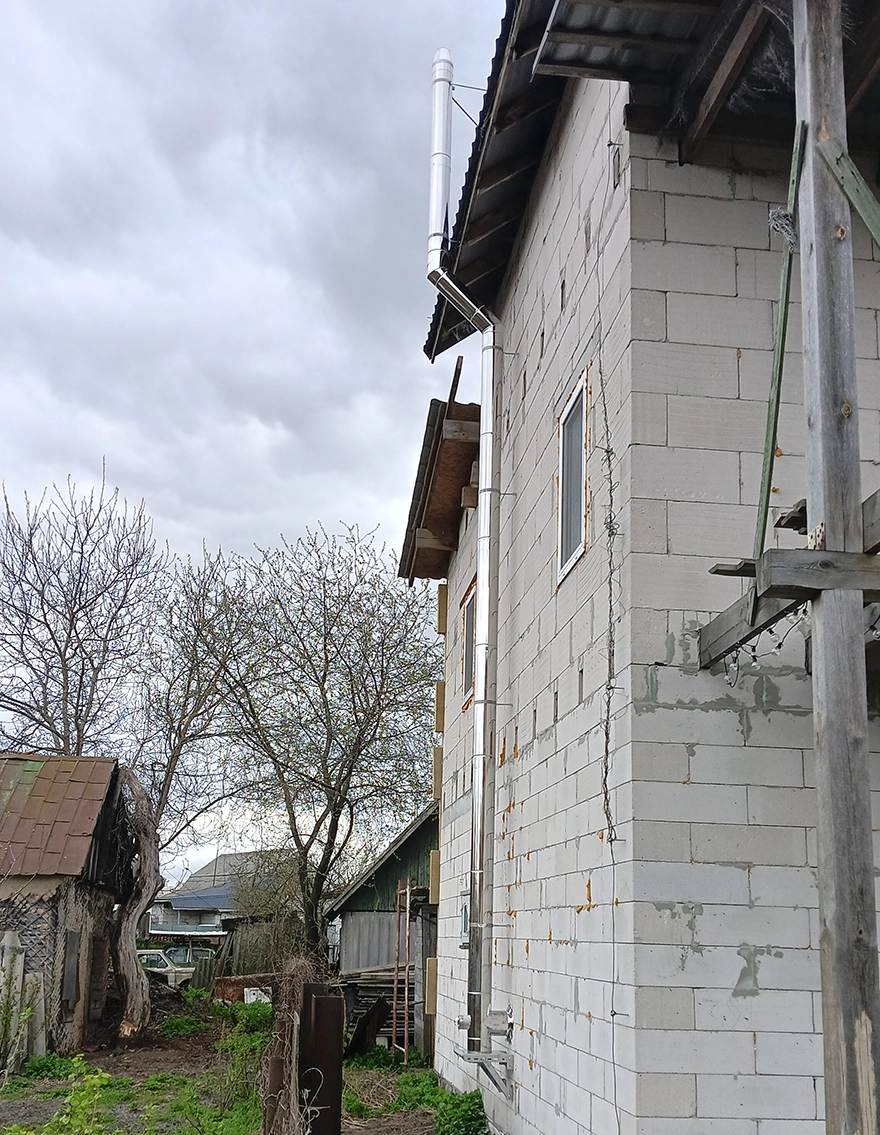 У результаті була реалізована надійна та безпечна система димовидалення, повністю адаптована під особливості даного об'єкта та встановленого опалювального обладнання. Всі елементи змонтовані з урахуванням майбутнього утеплення фасаду, вимог до тяги та зручності обслуговування. За необхідності монтажу димоходу або виконання аналогічних робіт — підберемо та реалізуємо оптимальне рішення під ваш об'єкт.