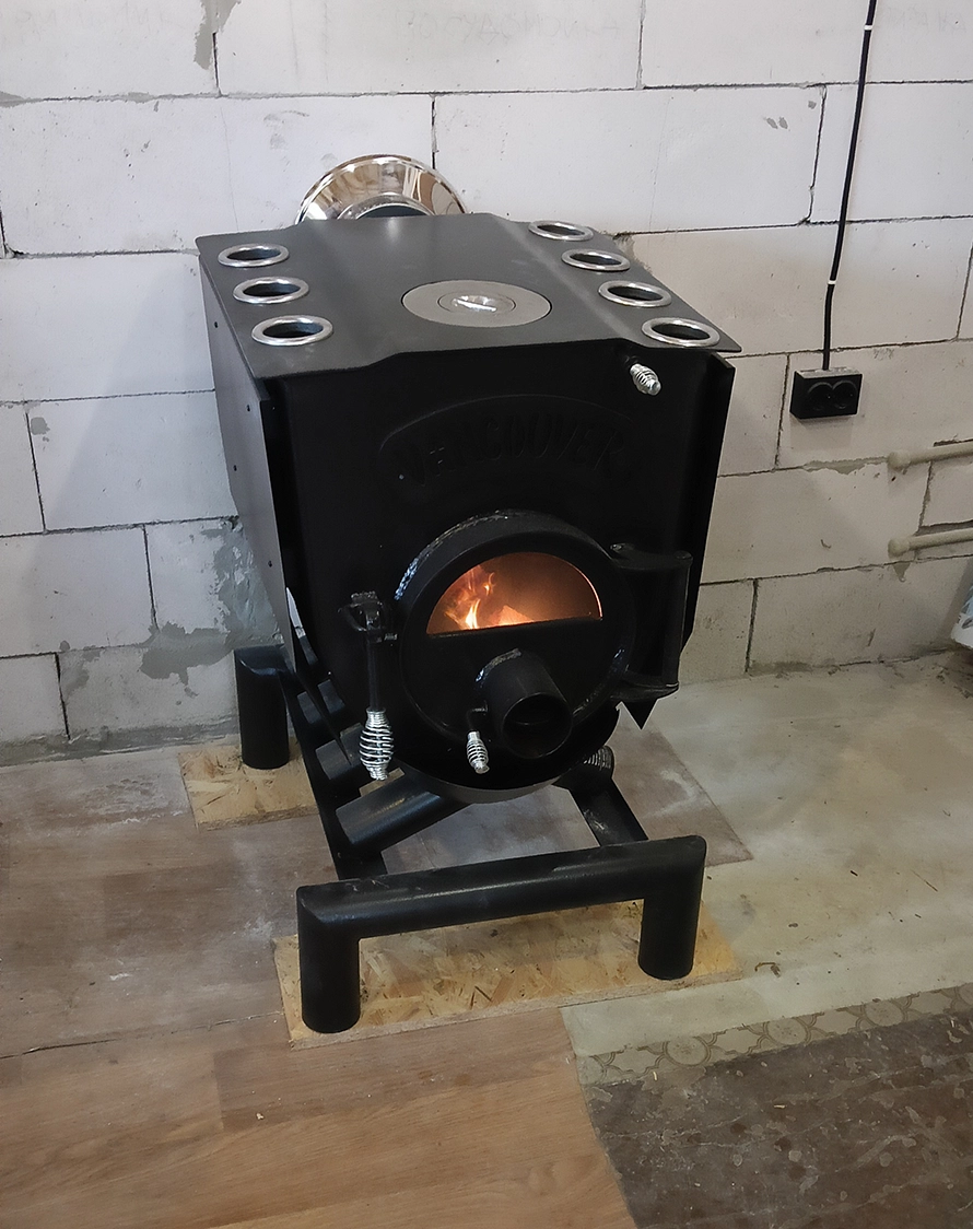 На першому фото представлена встановлена піч Булер'ян (тип Vancouver) з варильною поверхнею, змонтована на міцній металевій підставці. Таке рішення забезпечує зручну експлуатацію, покращену конвекцію повітря та безпечну відстань від підлоги. Піч оснащена характерними конвекційними трубами, які швидко прогрівають приміщення завдяки інтенсивній циркуляції повітря. Наявність варильної поверхні робить її не лише джерелом тепла, а й функціональним елементом для приготування їжі.
