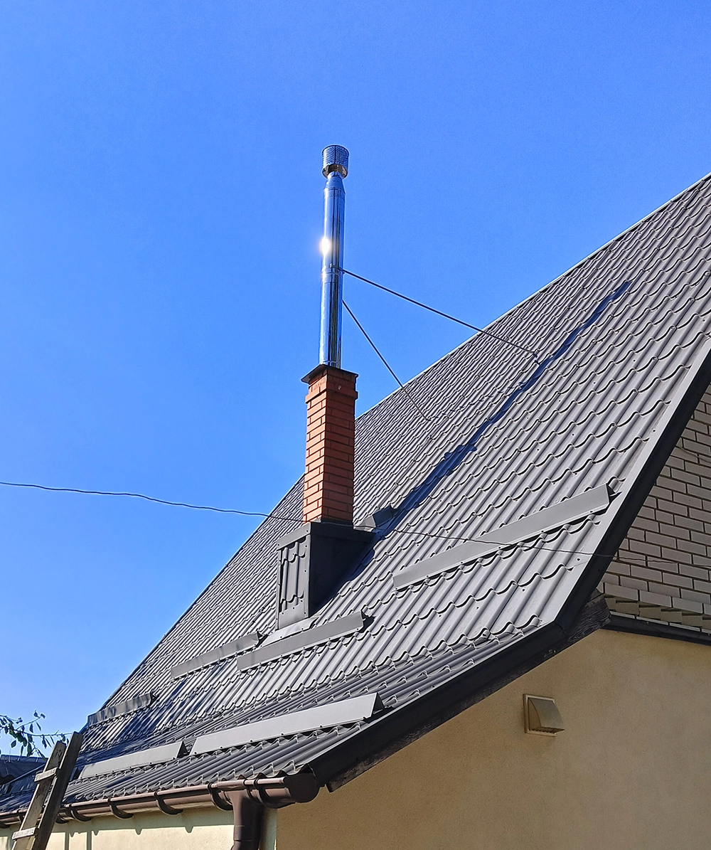 Нарощування димаря виконано з використанням спеціальної пластини-перехідника (закінчення димоходу), яка герметично закриває простір між цегляною шахтою та димарем. Це унеможливлює потрапляння опадів усередину шахти та захищає конструкцію даху від вологи. Уся система інтегрована в існуючий цегляний димохід без порушення його цілісності.