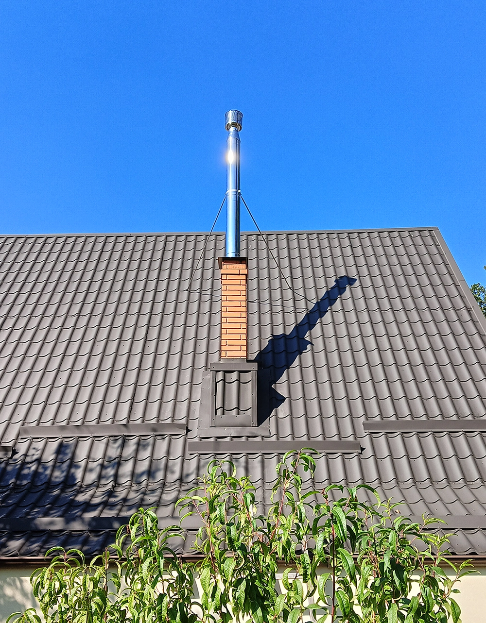 Особлива увага була приділена стійкості конструкції. Оскільки верхня частина димоходу виходить вище рівня покрівлі, на неї діють вітрові навантаження. Для надійної фіксації була застосована система розтяжок, яка забезпечує жорсткість і запобігає розхитуванню труби при сильному вітрі.