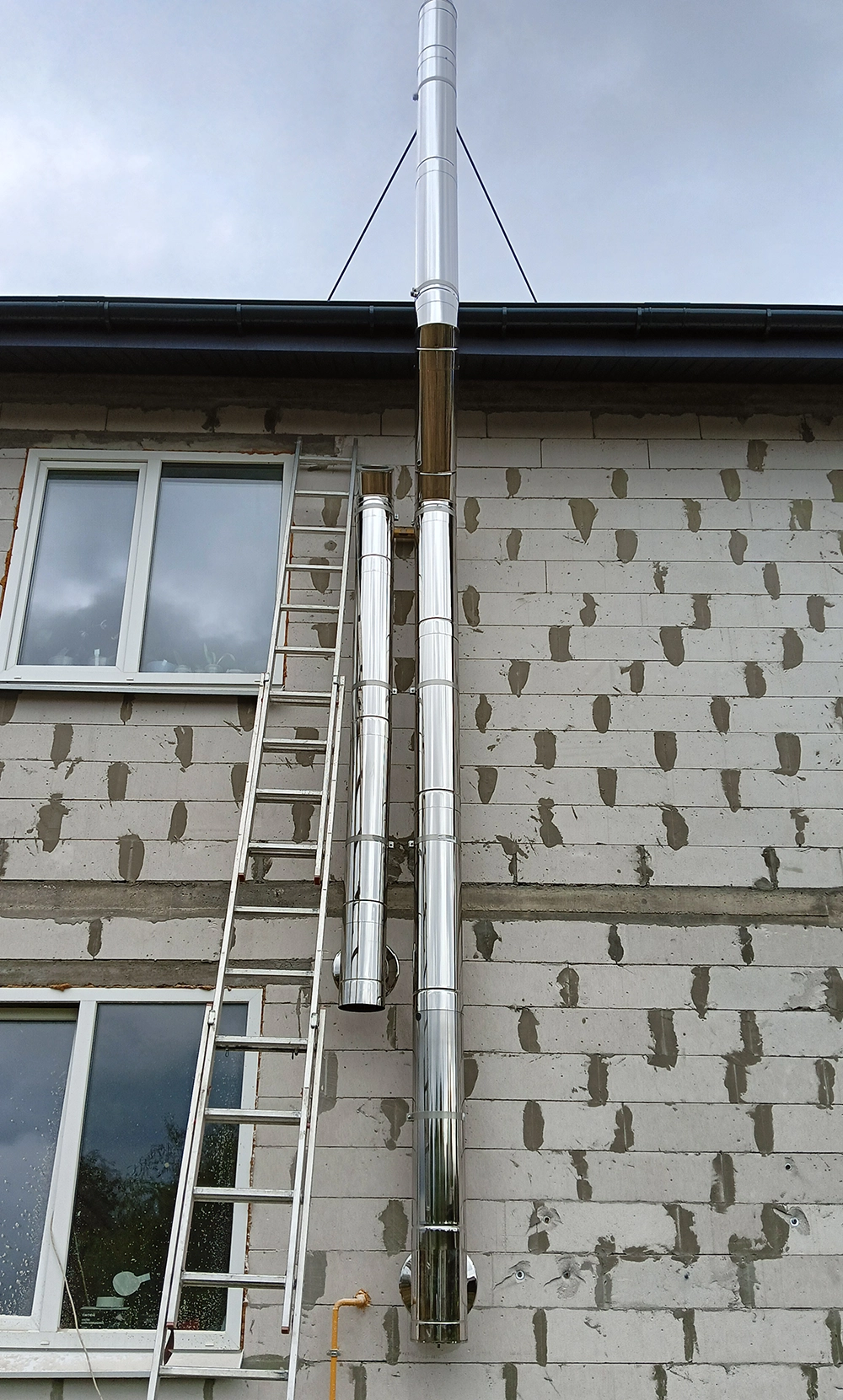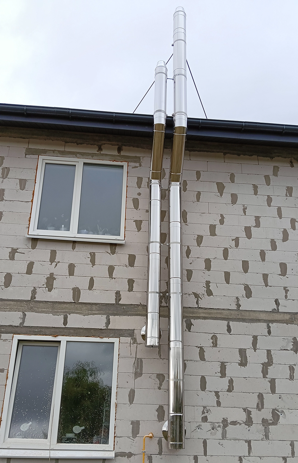 Димохід і вентиляційний канал виведені через стіну з подальшим підйомом вгору по фасаду будівлі. Вузол проходу через стіну виконано з дотриманням усіх вимог герметичності та теплоізоляції, що унеможливлює втрати тепла та запобігає потраплянню вологи всередину конструкції.